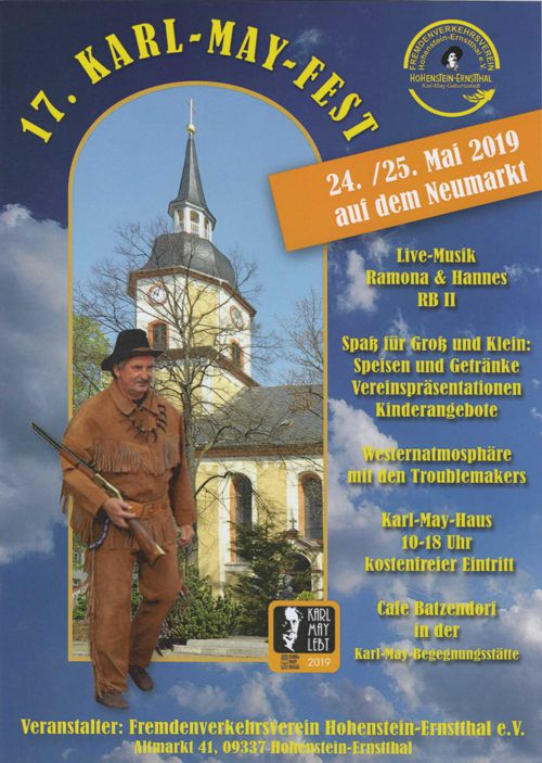 Spaß für Groß und Klein verspricht die 17. Auflage des Hohenstein-Ernstthaler Karl-May-Festes am 24. und 25. Mai auf dem Neumarkt der Karl-May-Geburtsstadt. Veranstaltet vom örtlichen Fremdenverkehrsverein animiert ein abwechslungsreiches und abenteuerliches Programm Besucher und Gäste des Festes zu Ehren des berühmtesten Sohnes der Stadt, dessen Welt und seine Träume zu entdecken. Nach der Eröffnung des Festes um 18.00 Uhr durch den Oberbürgermeister gestaltet den musikalischen Hauptpart am Freitagabend das Duo „Ramona & Hannes“ unter dem Motto „Country-Musik mit Herz und Verstand“. Eckpunkte des bunten Nachmittagsprogramms, dass am Samstag 14.00 Uhr beginnt, sind ein Freiluftgottesdienst der Kirchgemeinde St. Trinitatis, ab 15.00 Uhr das Kinderprogramm des Karolini Mitmachtheaters, die Siegerehrung des Karl-May-Kochwett-bewerbes und die Tänze der East Dance Company e.V. Chemnitz. Absoluter Höhepunkt am Samstagabend wird dann ab 19.00 Uhr sicher der schon traditionelle Auftritt der Hohenstein-Ernstthaler Kultband „RB II“ sein, die mit ihren mitreißenden Rhythmen wieder für eine zünftige Partystimmung sorgen wird.