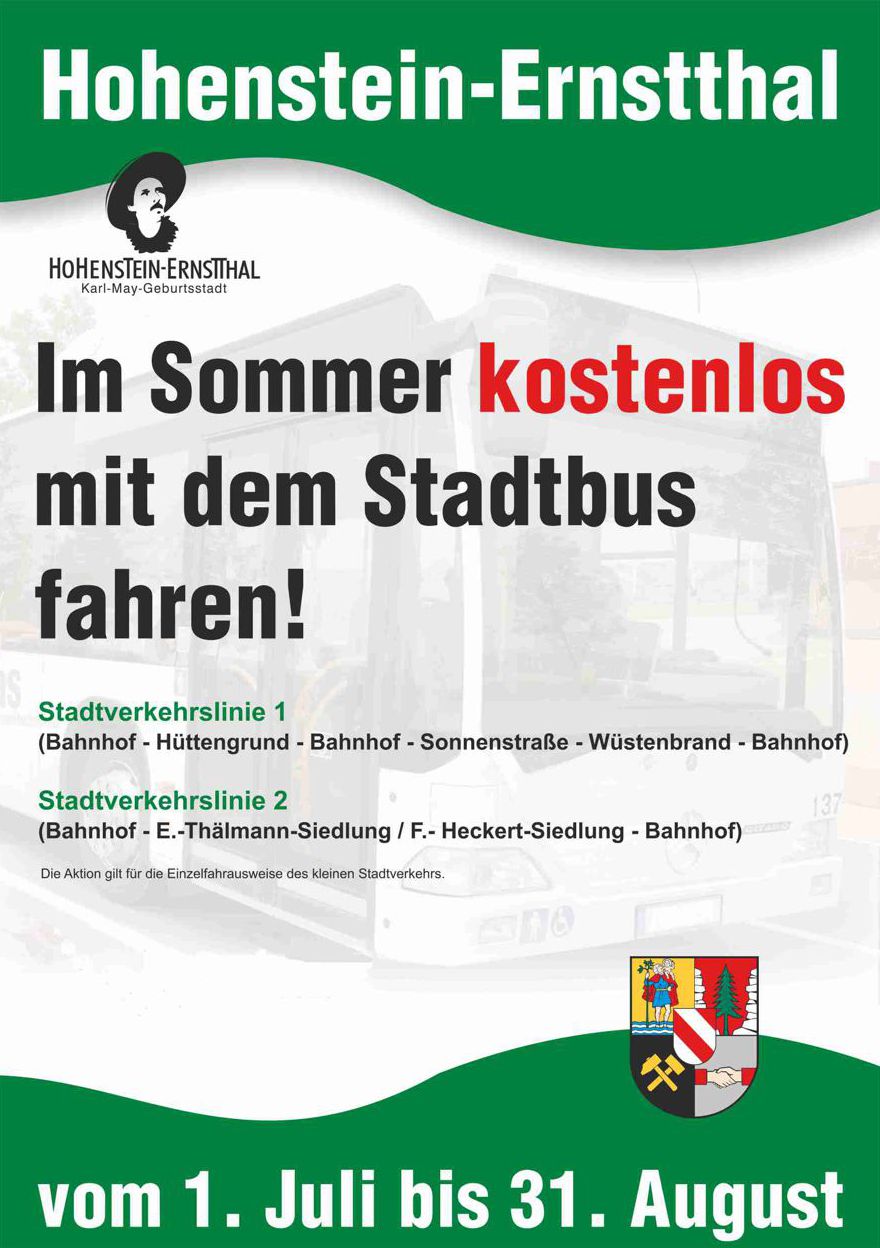 Daher können in den Ferienmonaten Juli und August in Hohenstein-Ernstthal die Stadtverkehrslinien 1 (Bahnhof – Hüttengrund – Bahnhof – Sonnenstraße – Wüstenbrand – Bahnhof) und 2 (Bahnhof – E.-Thälmann-Siedlung / F.-Heckert-Siedlung – Bahnhof) kostenfrei genutzt werden.
