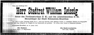 Ein in allen Kreisen unserer Bürgerschaft gleich gut bekannter und geachteter Mann, Herr Stadtrat William Zeißig, hat, was allen unerwartet kam, das Zeitliche gesegnet. Noch am Mittwoch abend bewegte er sich wohlgemut im Kreise lieber Bekannter in einem hiesigen Verein, und am nächsten Morgen machte ein Gehirnschlag seinem ersprießlichen Leben ein schnelles Ende. Gott hatte ihm ein selten langes Leben geschenkt – 82 Jahre, von denen er eine lange Reihe dem städtischen Gemeindewohl widmete. Zunächst betraute ihn das Vertrauen der Bürgerschaft mit dem Amt eines Stadtverordneten, und dann berief man ihn im Jahre 1868 zum Mitglied des Rates, dem er bis 1908 – also 40 Jahre lang angehörte; in diesem Jahre schied Herr Zeißig altershalber vorzeitig aus dem Amte. Seit 1874 war der Verstorbene Stellvertreter des Bürgermeisters. Nach 25jähriger Tätigkeit im Rate ward ihm das Ritterkreuz 2. Kl. des Albrechtordens verliehen und ihm gleichzeitig die Ehrenbürgerschaft zuerkannt. Bei seinem 30jährigen Stadtrats- Jubiläum ehrte die Stadt sein Wirken – zumal auf dem Gebiete der Armenpflege – durch Benennung einer Straße nach seinem Namen. Am 1. Januar 1908 vierzig Jahre im Stadtratsamte, ward der nun Verstorbene auch Ritter des Verdienstordens 2. Klasse; die Stadt errichtete zu Ehren Zeißigs eine Stiftung in Höhe von 2000 Mk. für wohltätige Zwecke, über deren Erträgnisse der Verewigte das Verfügungsrecht besaß. Das Andenken an den Verblichenen wird für alle Zeiten in unserer Stadt wach bleiben.