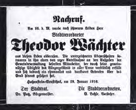 Von schwerem Leiden durch den Tod erlöst wurde am Sonnabend ein langjähriger Vertreter der Bürgerschaft unserer Stadt: Herr Gärtnereibesitzer Theodor Wächter. Der Dahingeschiedene, der im 53. Lebensjahre stand, war, nachdem er bereits früher dem Kollegium angehört hatte, seit 1908 Stadtverordneter. Ehrlich und geraden Charakters ward seine Mitarbeit allenthalben hochgeschätzt, was auch seine Berufung in eine ganze Anzahl städtischer Ausschüsse beweist. Er gehörte neben der staatlichen Steuereinschätzungskommission auch dem städtischen Abschätzungsausschuß, ferner dem Rechts- und Verfassungs-, dem Schul-, dem Park-, und dem Einquartierungsausschuß an. Nun hat der Tod seinem rastlosen geschäftlichen Streben und seiner Betätigung zum Wohle unserer Stadt ein Ziel gesetzt.