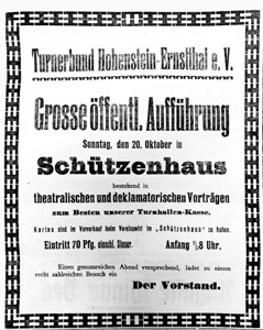 Wie stets bei seinen Veranstaltungen sah der Turnerbund gelegentlich seiner am gestrigen Sonntag im Schützenhause abgehaltenen Abend-Unterhaltung ein volles Haus, was ihm umso mehr zu gönnen ist, als er die aus ihnen gewonnenen Erträge zur Auffüllung seiner gerade in der Jetztzeit notleidenden Hallenbaukasse verwendet. Die Vortragsfolge war abwechslungsreich und die Darbietungen im Einzel- wie Gesamtspiel zeigten, daß die Mitwirkenden gute spielerische Kräfte sind, die alles daransetzen, ihre Gäste aufs beste zu unterhalten. Ueberwiegend war das heitere Spiel vertreten. Die Herzen rührten die Wiedergabe des Schauspiels „Heimatlos“ von Chr. Grönewald während die Einzelvorträge wie das Lustspiel „Schweres Geschütz“ von Philippi und der Schwank „Heute großes Schlachtfest“ die Lachmuskeln der Zuschauer in steter Bewegung hielten; hier fanden besonders gut veranlagte Kräfte Gelegenheit, sich mit ihrem Spiel bei den Gästen einzuschmeicheln. Das Ganze hinterließ den denkbar besten Eindruck, der Beifall wollte fast kein Ende nehmen.