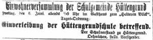 Die für gestern abend nach dem „Heiteren Blick“ einberufene Einwohnerversammlung der Schulgemeinde Hüttengrund war nicht so zahlreich besucht, wie wohl angesichts der wichtigen Tagesordnung: „Einverleibung der Hüttengrundschule“ zu erwarten gewesen wäre. Nach der Begrüßung teilte Herr Gutsbesitzer Oehmichen mit, daß der Stadtrat dringend einen Beschluß wünscht, ob die Vereinigung beschlossen werden soll oder nicht, damit der Schulinspektion Bescheid gegeben werden kann. In der Aussprache meinte Herr Oberlehrer Hausmann, das die Gegner der Vereinigung (das sind viele aus der Stadt und die entfernt wohnenden Hüttengrunder) als Grund dafür die schlechten Wege und der Wechsel der Kinder aus einer acht in die vierklassige Schule angeben, während die Freunde sich wünschen, ihren Kindern eine bessere Schulausbildung geben zu können. Herr Herklotz sprach sich für die Vereinigung aus, wenn die Härten beseitigt würden, die darin liegen, daß die entfernt wohnenden Hüttengrunder ihrer Kinder nach der Stadt, die entfernt wohnenden Hohensteiner nach dem Hüttengrund schicken sollten. Nach weiterer kurzer Aussprache wurde der Vorschlag des Herrn Oberlehrer Hausmann in folgendem Sinne an den Stadtrat zu schreiben: „Wir erkennen zwar den Segen der Vereinigung an, lehnen es aber aus verschiedenen Gründen ab, uns jetzt dafür zu erklären, sondern wollen die vier Jahre Wartezeit, die allgemein bewilligt sind, ausnutzen“, einstimmig angenommen und die Versammlung darauf geschlossen. Wir wollen hoffen, daß der Stadtrat Mittel und Wege findet, um beiden Parteien, den Freunden wie den Gegnern der Vereinigung, gerecht zu werden und Härten zu beseitigen.