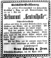 Hüttengrundschule betr. Die Bewohner des Hüttengrundes und der angrenzenden Straßen (König-Albert-, Bismarck- (Lerchenstraße), Luther-, Zeißig-, Schiller-, Hüttengrundstraße) werden für Mittwoch, den 21. Mai 1919, abends ¼ 9 Uhr, zu einer Versammlung nach der Hüttenmühle gebeten, in der über die Frage der Vereinigung der Hüttengrundschule mit der Altstädter Schule in Hohenstein- Ernstthal beraten werden soll. Der Schulvorstand Hüttengrund. August Oehmigen, stellv. Vorsitzender.