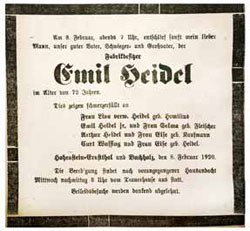 Nach längerem Kranksein starb gestern abend Herr Fabrikbesitzer Emil Heidel, ein selbstgemachter Mann, der aus kleinen Anfängen heraus durch Fleiß und Energie seine Weberei zu einer der maßgebenden und angesehensten unserer Stadt zu machen gewußt hatte. Mit seiner Familie trauert ein großer Kreis von Freunden um den alten Herrn, der nach des Tages Last und Mühen als gerngesehener Gesellschafter sich überall großer Sympathien erfreute.